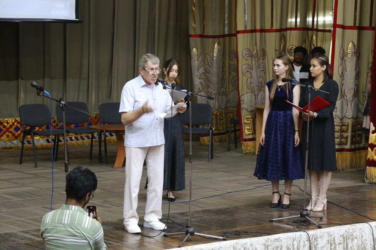17 человек были удостоены грамот за прилежную учебу и активное участие в научной и общественной жизни. И абсолютно все студенты получили памятные подарки от фирмы-контрактера. С особенным волнением для поздравительной речи на сцену проследовали представители кафедры терапии №2 специальности «Лечебное дело». К. Джайлобаева, З. Раджапова и Ж. Мамасаидов поздравили студентов с окончанием университета, особо отметив Гангулу Бхавьянджали, Манчуконда Яшвантхнадх, Кунчам Лалитха, Фархин Аяз, Виктора Рангснамей, Сишту Адитья. Это те студенты, которые с трепетом в душе на протяжении 4,5 и 6 курсов обучения активно посещали студенческий кружок на вышеупомянутой кафедре, писали свои первые научные работы, представляли их на конференциях различного уровня.