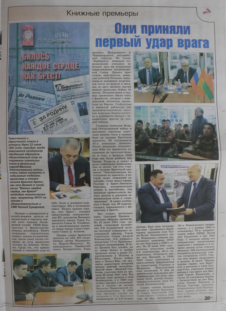 С таким заголовком в очередном номере газеты «Слово Кыргызстана» вышла статья, посвященная презентации и передачи партии книг «Билось каждое сердце, как Брест» (автор – кандидат исторических наук, проректор КРСУ по информации и связи с общественностью Леонид Сумароков) Пограничной службе ГКНБ Кыргызстана и Министерству обороны республики. Книга посвящена героическому подвигу кыргызстанцев-пограничников в начальный период Великой Отечественной войны, ценою своей жизни стоявших на пути вражеских полчищ на рубежах Отчизны.