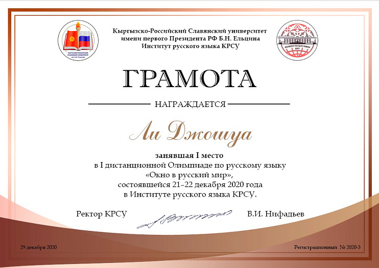 29 декабря в холле главного корпуса Кыргызско-Российского Славянского университета им. первого Президента Российской Федерации Б.Н. Ельцина состоялось награждение победителей I дистанционной олимпиады по русскому языку как иностранному и русскому языку как неродному «Окно в русский мир», организованной 21-22 декабря Институтом русского языка КРСУ.