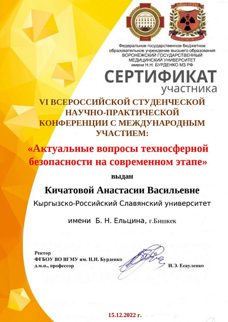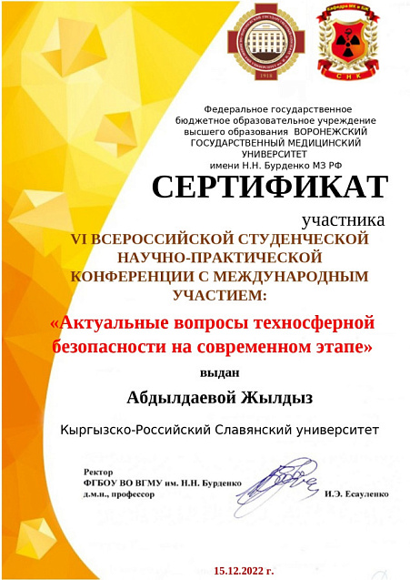 Так, из Воронежа пришли документы, свидетельствующие, что наши студентки – Анастасия Кичатова и Жылдыз Абдылдаева – успешно выступили на VI Всероссийской студенческой научно-практической онлайн-конференции с международным участием «Актуальные вопросы техносферной безопасности на современном этапе», которую организовал Воронежский ГМУ им. Н. Бурденко совместно с РНИМУ им. Н. Пирогова, Рязанским ГМУ им. И. Павлова, Кубанским ГМУ, Саратовским ГМУ им. В. Разумовского, Северным ГМУ, Тамбовским госуниверситетом им. Г. Державина, Тверским ГМУ, Воронежским институтом МВД РФ, а также Белорусским ГМУ, Гомелевским ГМУ и нашим КРСУ.