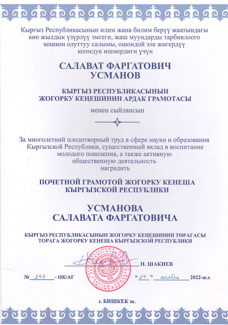 Проректор по учебной работе Кыргызско-Российского Славянского университета, профессор Салават Усманов удостоен Почетной грамоты Жогорку Кенеша Кыргызской Республики за многолетний плодотворный труд в сфере науки и образования КР, существенный вклад в воспитание молодого поколения, а также активную общественную деятельность.