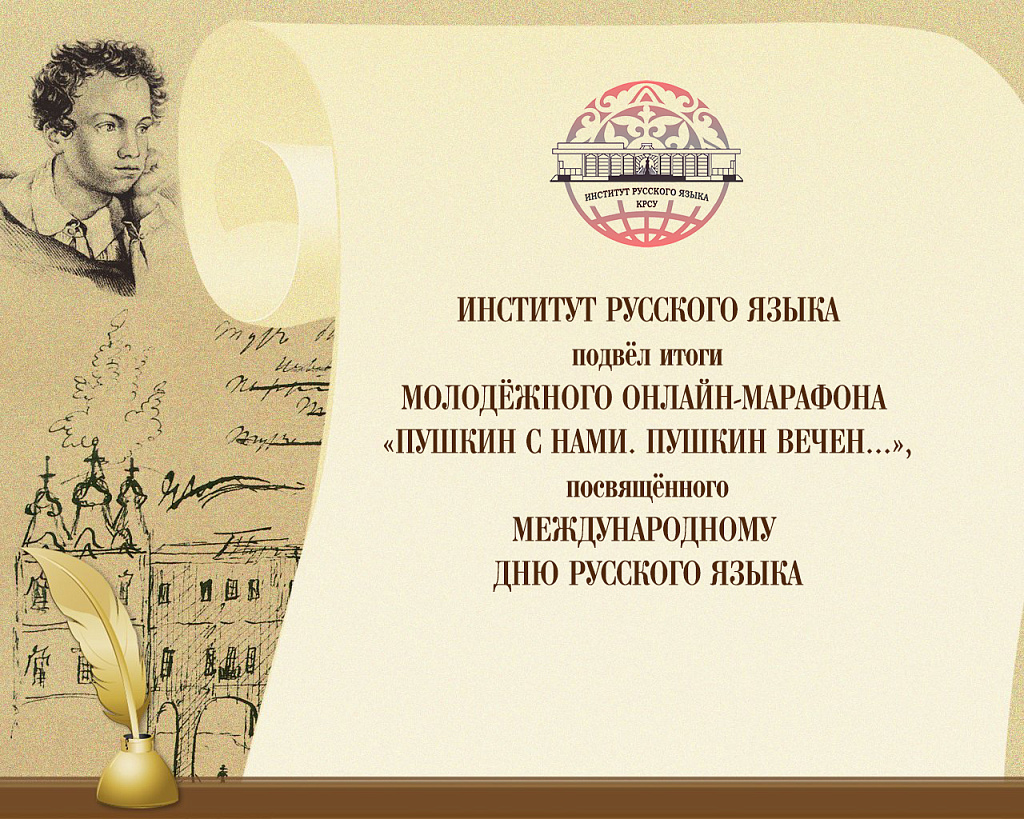 3 июня, в преддверии Международного дня русского языка, состоялось подведение итогов молодежного онлайн-марафона «Пушкин с нами. Пушкин вечен…», организованного Институтом русского языка Кыргызско-Российского Славянского университета имени первого Президента Российской Федерации Б.Н. Ельцина. Культурно-образовательная акция была приурочена к 222-летию со дня рождения гения русской словесности А.С. Пушкина. Главной целью онлайн-марафона явилось создание площадки для реализации творческого потенциала подрастающего поколения, приобщения учащейся молодежи к русской классической литературе.