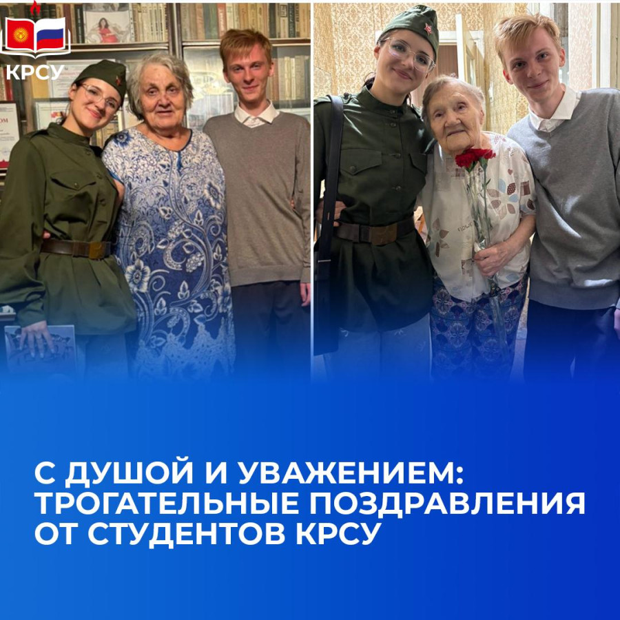 9 мая студенты Кыргызско-Российского Славянского университета Яна Никулина и Максим Калинин навестили двух пожилых женщин, чтобы поздравить их с Днём Победы, выразить уважение и сказать слова благодарности за их жизненный путь.