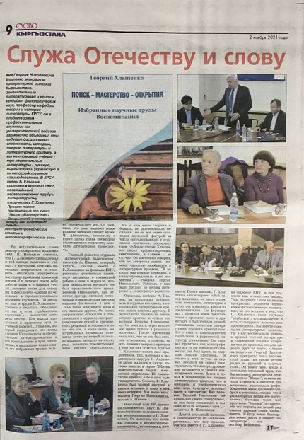 В очередном выпуске столичной газеты «Слово Кыргызстана» (за 2 ноября 2021 года) вышла статья о Георгие Хлыпенко – замечательном литературоведе и критике, профессоре кафедры теории и истории литературы КРСУ.