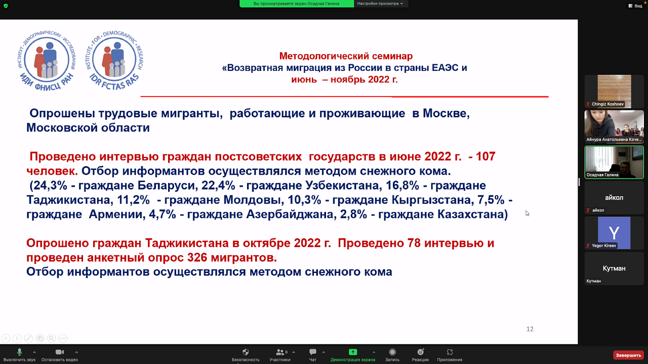 27 октября 2022 года Международный аналитический клуб "Иссык-Куль - Большая Евразия" и Отдел исследования социально-демографических процессов в ЕАЭС Института демографических исследований (ИДИ) ФНИСЦ РАН провели онлайн-семинар и запустили социологическое исследование, посвящённое изучению возвратной миграции и эмиграции из Российской Федерации в Республику Кыргызстан. Доктор социологических наук, профессор Г.И. Осадчей, кандидат социологических наук Е.Ю. Киреева и доктор экономических наук, профессор, профессор кафедры менеджмента КРСУ имени Б.Н. Ельцина А.А. Кочербаевой ознакомили студентов КРСУ с возможностями опросных методов в социологии, получили навыки проведения анкетного онлайн-опроса, а также интервью в "полевых" условиях.