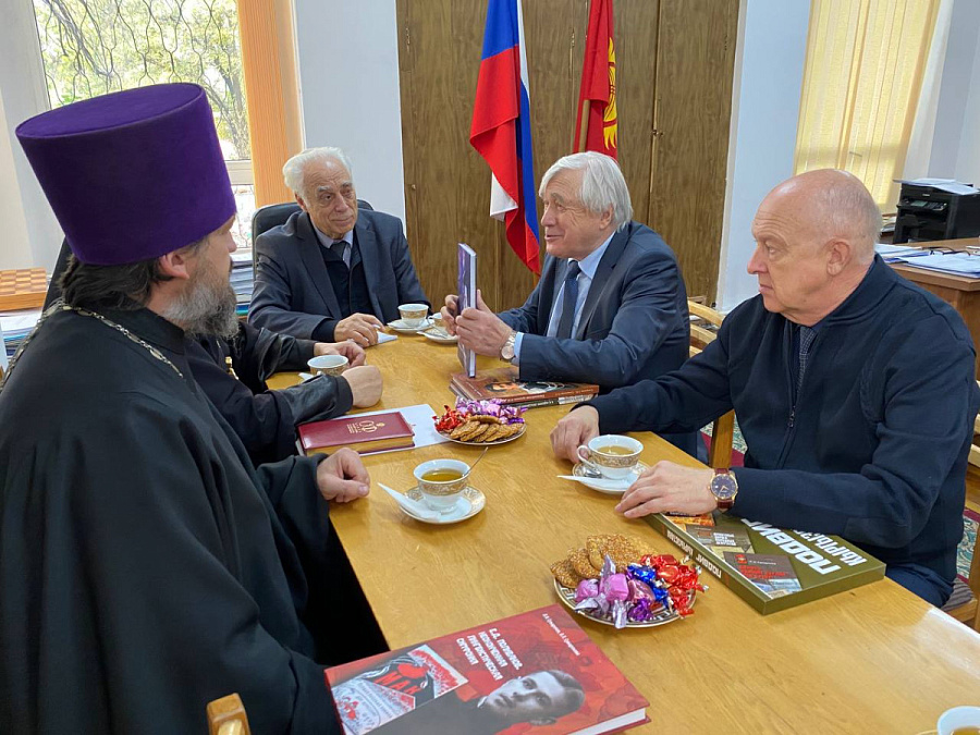 В завершении встречи ректор КРСУ В. Нифадьев подарил владыке книги, изданные в университете (несколько книг за авторством Л. Сумарокова и О. Сумароковой, а также перевод эпоса «Манас» на русский язык в поэтической форме).