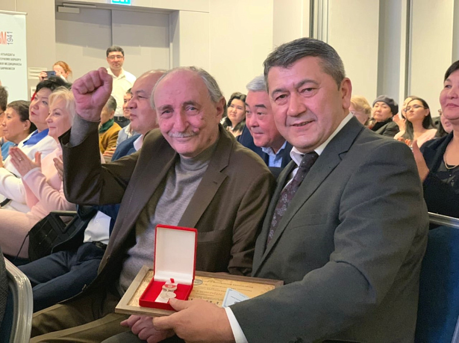 Далее состоялась церемония награждения медалями академика М. Миррахимова заведующего кафедрой терапии №2 КРСУ профессора И. Сабирова и доцента той же кафедры А. Данияровой.