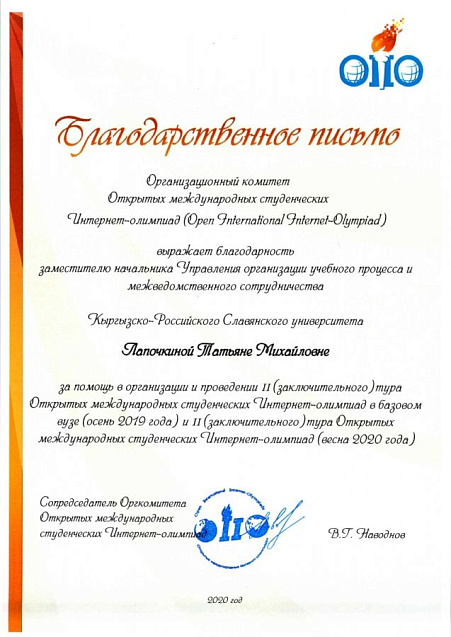 За помощь в организации и проведении заключительного тура Интернет-олимпиад заместителю начальника Управления организации учебного процесса и межведомственного сотрудничества КРСУ Татьяне Лапочкиной вручено благодарственное письмо от Организационного комитета олимпиад.