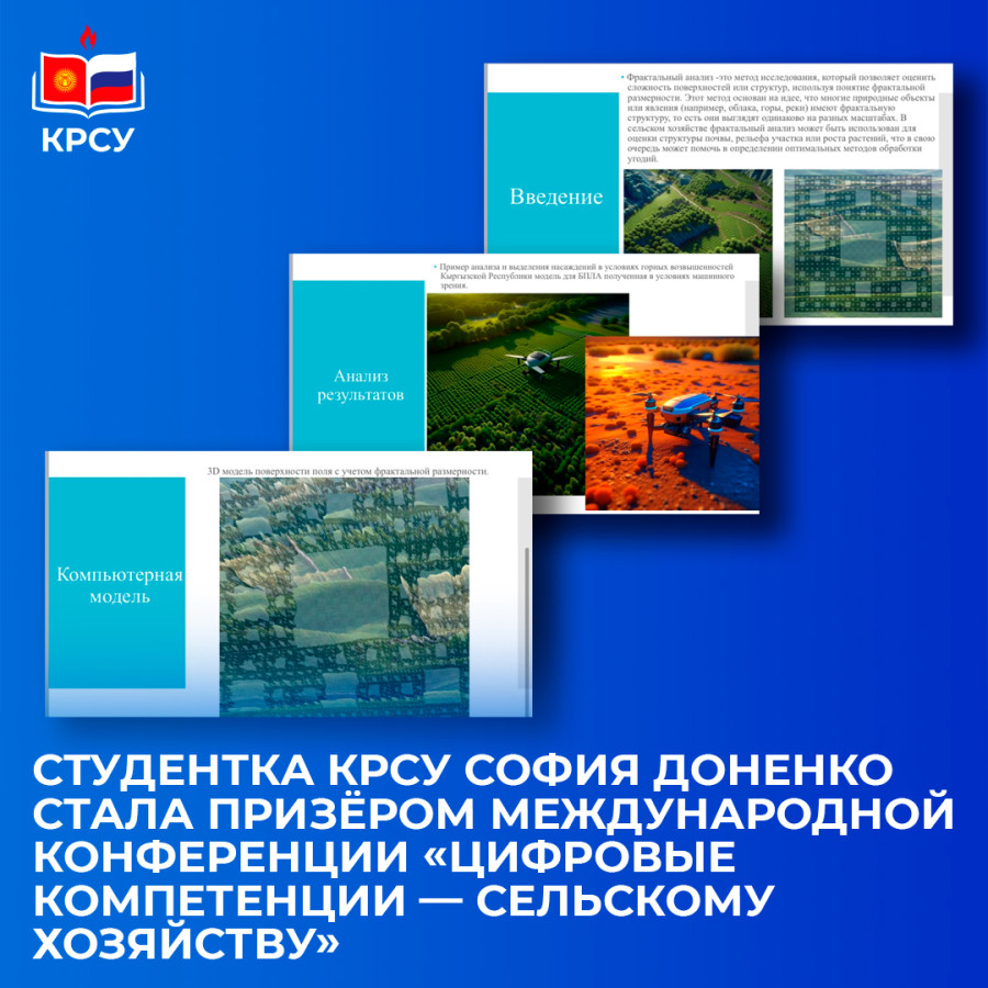 Студентка естественно-технического факультета Кыргызско-Российского Славянского университета София Доненко заняла третье место на международной научно-практической конференции «Цифровые компетенции — сельскому хозяйству», проходившей в рамках реализации проекта «Цифровые кафедры» программы «Приоритет-2030».