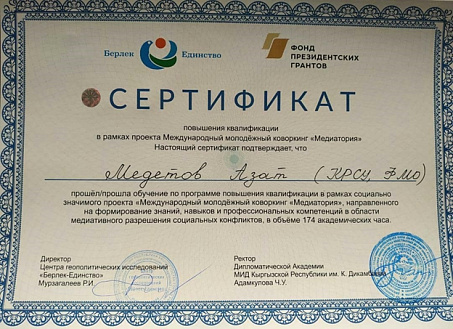 Все участники получили сертификаты Центра геополитических исследований «Берлек-Единство», а лучшие студенты форума (А. Медетов и Ч. Добулбекова, КРСУ) награждены цифровыми браслетами от Центра геополитических исследований, представители которого выразили благодарность декану факультета международных отношений КРСУ С. Усманову и старшему преподавателю кафедры «Международные отношения» Ч. Кашкараевой за содействие в организации образовательного процесса в рамках программы повышения квалификации «Международный молодежный коворкинг «Медиатория» для молодежи России, Казахстана и Кыргызстана».