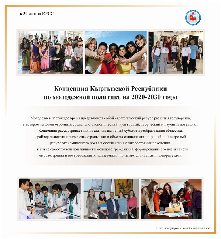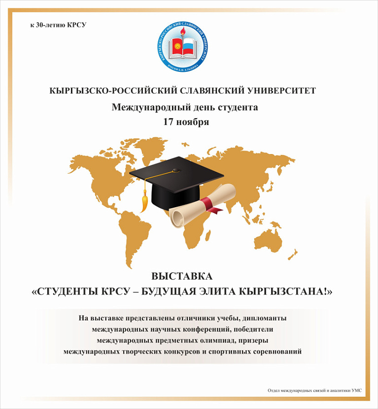 17 ноября по инициативе Отдела международных связей и аналитики УМС КРСУ в фойе главного корпуса открылась фотовыставка «Студенты КРСУ – будущая элита Кыргызстана», посвященная Международному дню студентов и предстоящему юбилею университета – 30-летию с момента образования.