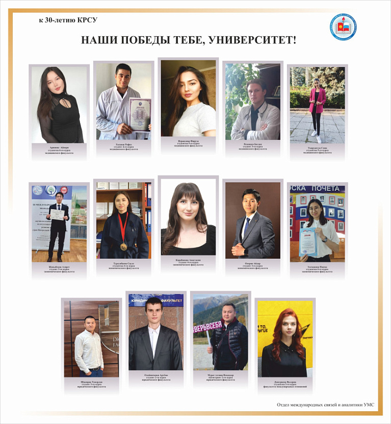 Вот имена наших героев: Айвар Каримов, Батыр Койчуев, Александр Коротенко, Софья Ахмедова (гуманитарный факультет), Алексей Лысенков, Кирилл Щербаков, (ЕТФ), Данил Мистрюков, Тамерлан Шакиров, Артем Олейниченко, Мурат тегини Искендер (юридический факультет), Артем Шапилов, Азирет Жаныбеков, Сауле Турсунбаева, Анастасия Карабанова, Айдар Осоров (экономический факультет), Дамир Акматов, Камель кызы Алтынай (ФАДИС), Валерия Дмитриева, Зуура Искандерова, Куанышбек Мыкыев, Руслан Садирдинов, Татьяна Шишенина (ФМО), Тхируаптхи Сони, Рафиз Гасанов, Фируза Исраилова, Богдан Рязанцев, Айпери Аринова (медицинский факультет).