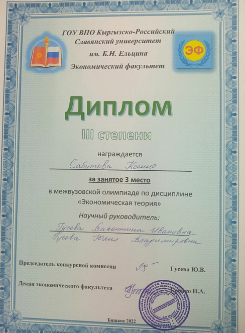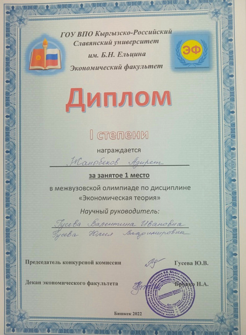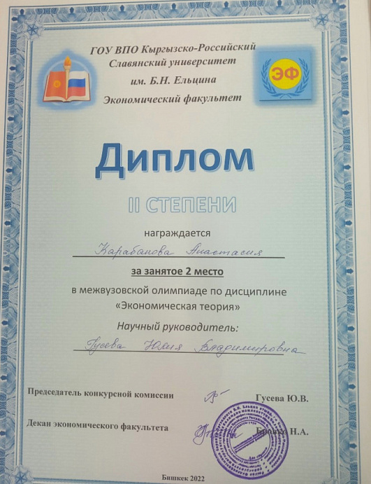 10 мая кафедра экономической теории КРСУ совместно с Институтом профессиональных бухгалтеров и аудиторов провела межвузовскую олимпиаду по экономической теории. В ней приняли участие студенты Кыргызско-Российского Славянского университета, Университета АДАМ/БФЭА, Международного университета Кыргызстана, Академии туризма, Международной академии управления, права, финансов и бизнеса.