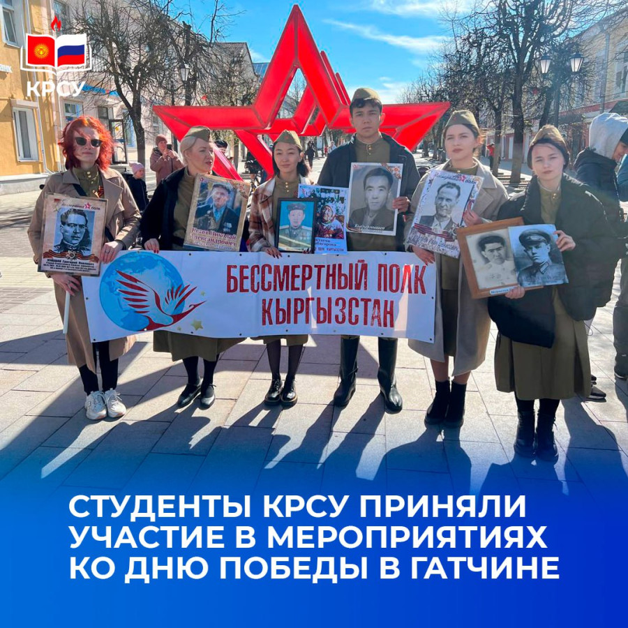 9 мая студенты Кыргызско-Российского Славянского университета присоединились к памятным мероприятиям в городе Гатчина (Ленинградская область), приуроченным ко Дню Победы. Молодёжь приняла участие в торжественном возложении цветов, а также прошла в колонне «Бессмертного полка», неся портреты своих дедов и прадедов — участников Великой Отечественной войны.