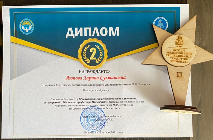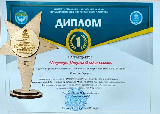 Студенты кафедры менеджмента КРСУ в составе команд студентов из разных вузов заняли все призовые места по дисциплине «Менеджмент. Маркетинг», а Злата Коржова (3 курс) получила гран-при олимпиады в этой секции за разработку эффективной программы продвижения для кинотеатра «Манас».