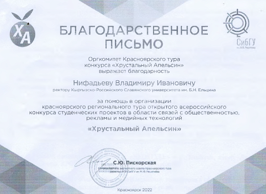 Оргкомитет Красноярского регионального тура Конкурса «Хрустальный Апельсин» выразил благодарность ректору, академику Владимиру Нифадьеву, преподавательскому составу и студентам Кыргызско-Российского Славянского университета имени Б. Ельцина за помощь в организации, отзывчивость и многолетнее сотрудничество.