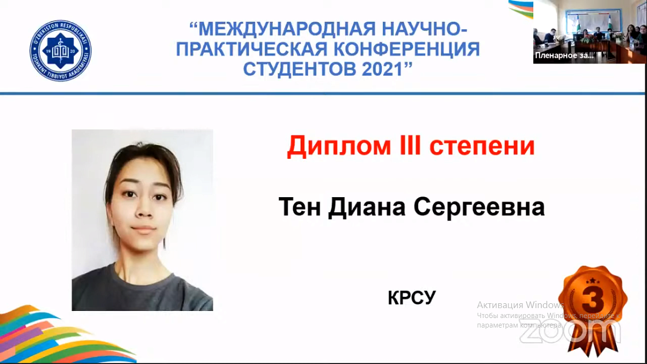 По итогам конференции студенты-медики КРСУ получили один диплом первой степени (В. Иванина и Н. Тайникова «Ультраструктурная организация печени при действии коронного разряда высоковольтных линий электропередач в условиях высокогорья»), два диплома второй степени (И. Тажиматов и Э. Хаснудинова «Действие глибенкламида на состояние гистофизиологии поджелудочной железы на фоне черепно-мозговой травмы»; С. Самаганова и Э. Жураева «Инфекционные агенты, как угроза репродуктивному здоровью молодого поколения»), один диплом третьей степени (Б. Сотников и Д. Тен «Ремоделирование сосудистого русла головного мозга крыс при высокобелковом питании»), а также три грамоты.