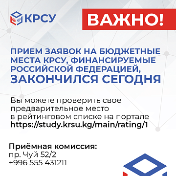 Важно! Прием заявок на бюджетные места КРСУ, финансируемые Российской Федерацией, закончился сегодня 25 июля 2024 Университет