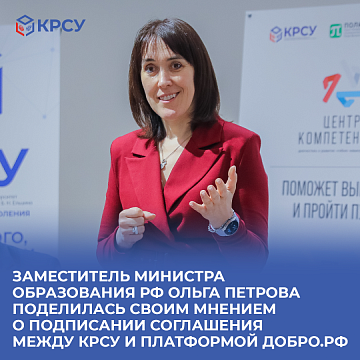 Заместитель Министра науки и высшего образования РФ Ольга Петрова поделилась своим мнением о подписании соглашения между КРСУ и платформой Добро.рф 14 июня 2024 Минобрнауки