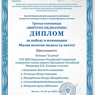 Команда КРСУ «Д-димер» завоевала «малую золотую медаль» олимпиады «Виртуоз педиатрии» 22 мая 2022 Медицина