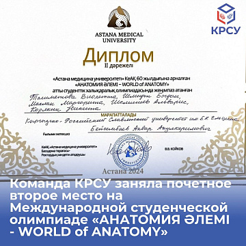 Команда КРСУ заняла второе место на Международной студенческой олимпиаде «АНАТОМИЯ ӘЛЕМІ - WORLD of ANATOMY» 25 ноября 2024 Студенты