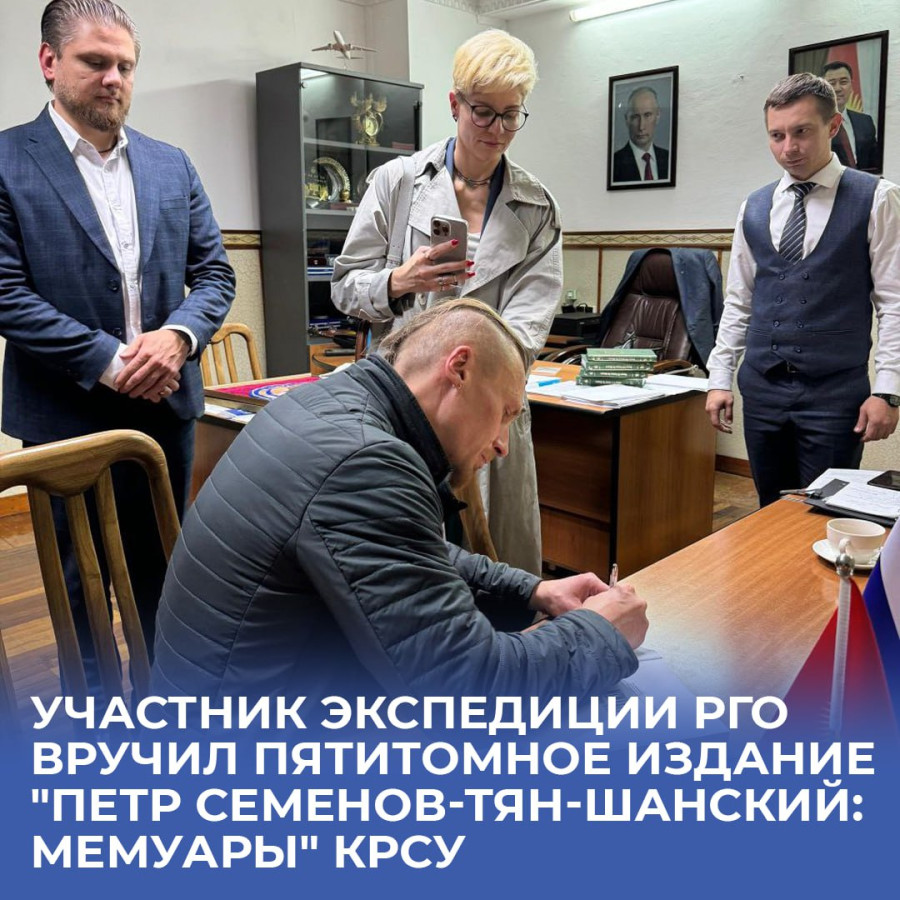 Сегодня в Кыргызско-Российском Славянском университете состоялась встреча, на которой исполняющему обязанности ректора КРСУ Сергею Волкову было вручено пятитомное издание "Петр Семенов-Тян-Шанский: Мемуары". Церемонию передачи провел участник экспедиции Российского географического общества Роман Моськин, который посетил университет в рамках научного сотрудничества.