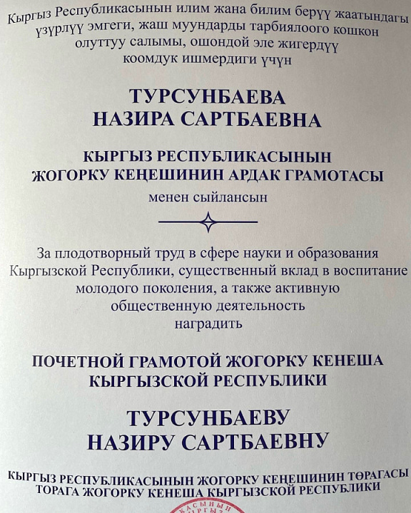 Ранее доцент КРСУ удостоилась Почетной Грамоты Жогорку Кенеша КР за плодотворный труд в сфере науки и образования КР, существенный вклад в воспитание молодого поколения, а также активную общественную деятельность.