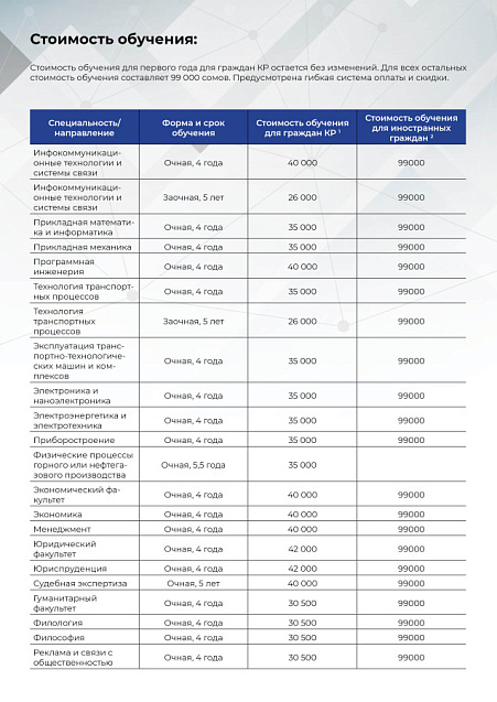 Все ресурсы для регистрации онлайн и стоимость за контрактную форму обучения для граждан КР и иностранных студентов.