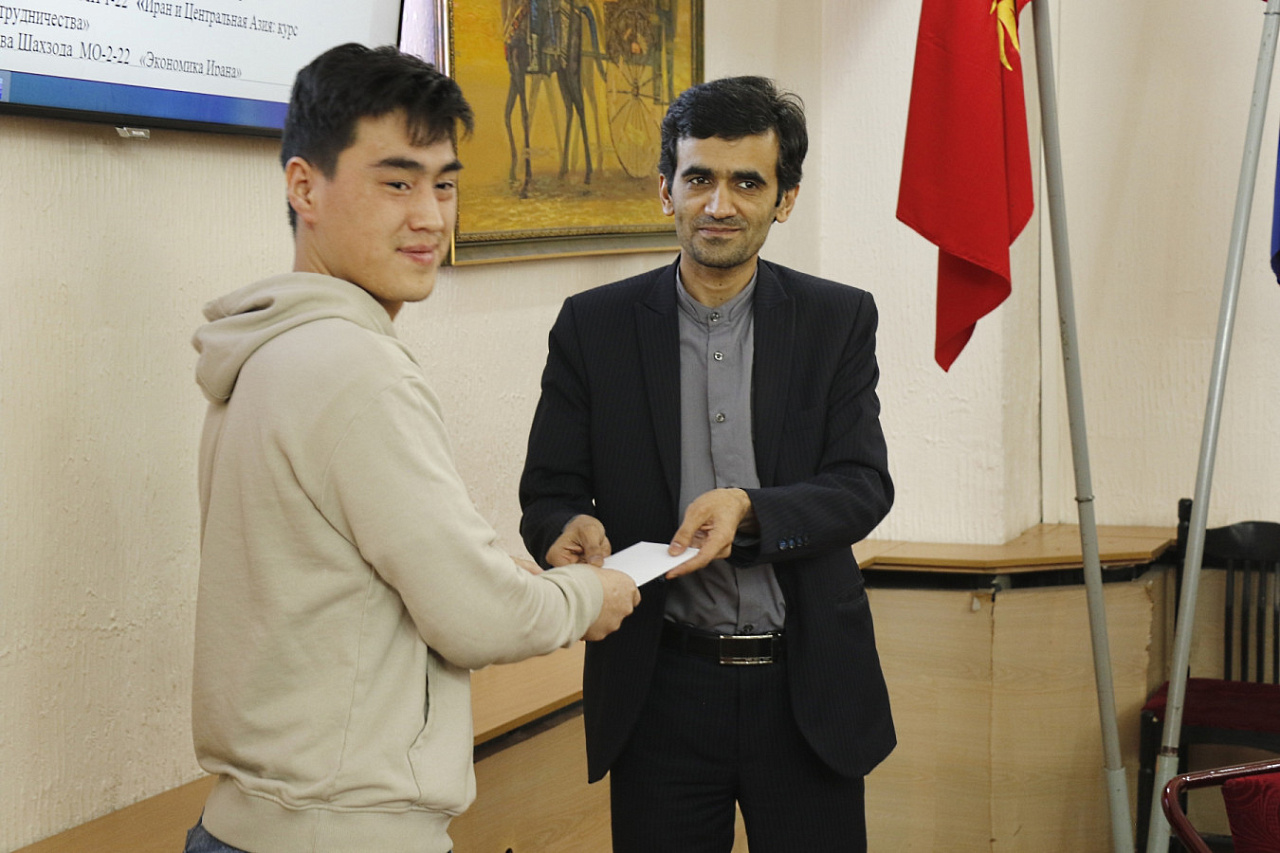 Г-н А. Тогани выразил признательность всем участникам, отметив серьезный подход к выбору и реализации тем. Авторы трех лучших рефератов получили денежные призы (первое место жюри присудило студентке Бегимай Соромбаевой). Остальные участники стали обладателями поощрительных призов, врученных лично директором Культурного Представительства Посольства ИРИ в КР.