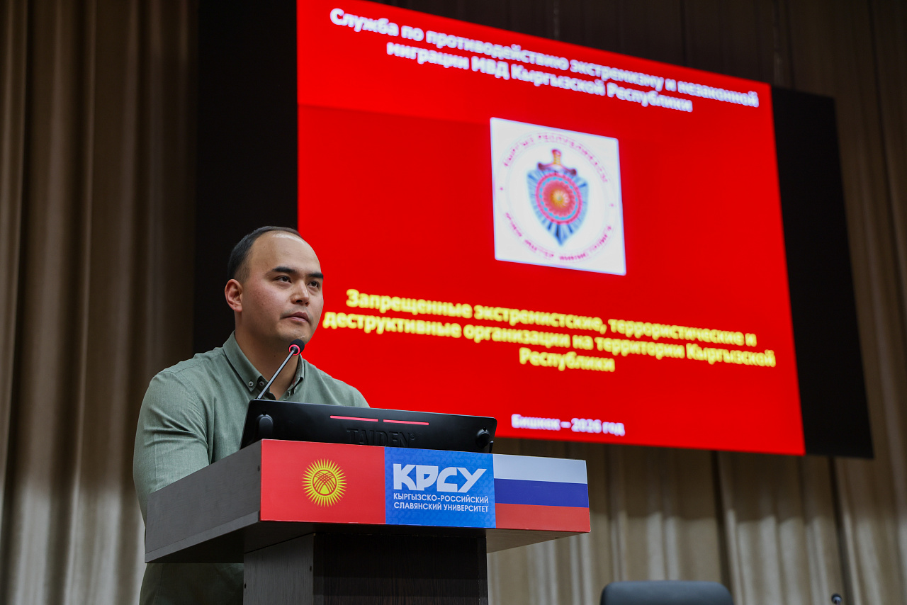 Сегодня в Кыргызско-Российском Славянском университете состоялась лекция для студентов гуманитарного и юридического факультетов, посвящённая вопросам противодействия экстремизму и терроризму.