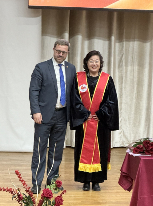 В завершении праздника Денис Фомин-Нилов вручил Ду Дэвэнь диплом и мантию Почетного доктора Кыргызско-Российского Славянского университета имени Б. Ельцина.