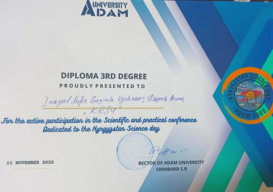 11 ноября по инициативе Департамента медико-биологических дисциплин Высшей Школы Медицины, университета «Адам» состоялась студенческая научно-практическая конференция «Актуальные проблемы науки: взгляд студентов», приуроченная ко Дню науки Кыргызстана и объединившая участников из вуза-организатора, а также КГМА, КРСУ, ММУ, КГУ им. И. Арабаева, медвузов АЗМИ, Авиценна, АВС и др.