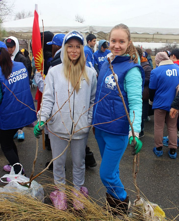 «Волонтеры Победы», представители студенческих и школьных молодежных объединений Киргизии высадили 80 хвойных и лиственных деревьев в память о жертвах Великой Отечественной войны.