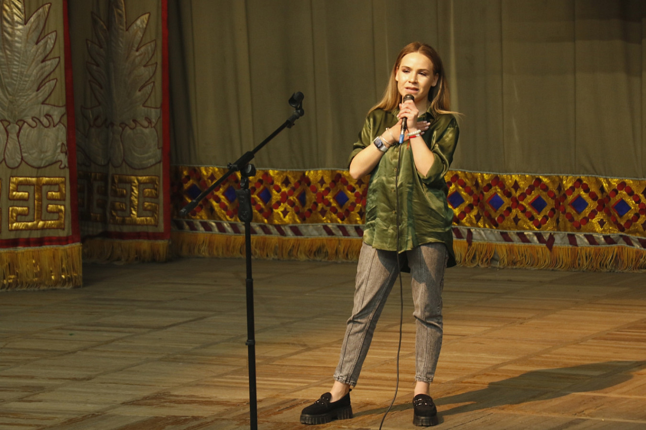 Тон концертной программы задали наши симпатичные ведущие – Арина Пудовкина и Абдыкеримов Али Акпер Хасан уже имеющие неоднократный опыт сценических выступлений. И в момент фестивального старта они решили не ограничиваться прозой, а сразу обратились к аудитории поэтическим «шпилем», представив залу высокое жюри в составе заслуженного работника культуры Владимира Тулина, хореографа Евгения Прокопенко и артиста театра русской драмы им. Ч. Айтматова Станислава Касьянова, а затем пригласив на сцену двух первокурсниц-комузисток Жедигерову Жанылай и Жанышбек кызы Беназир, придавших аудитории бодрого настроения своим исполнением знаменитой мелодии «Маш Ботой».