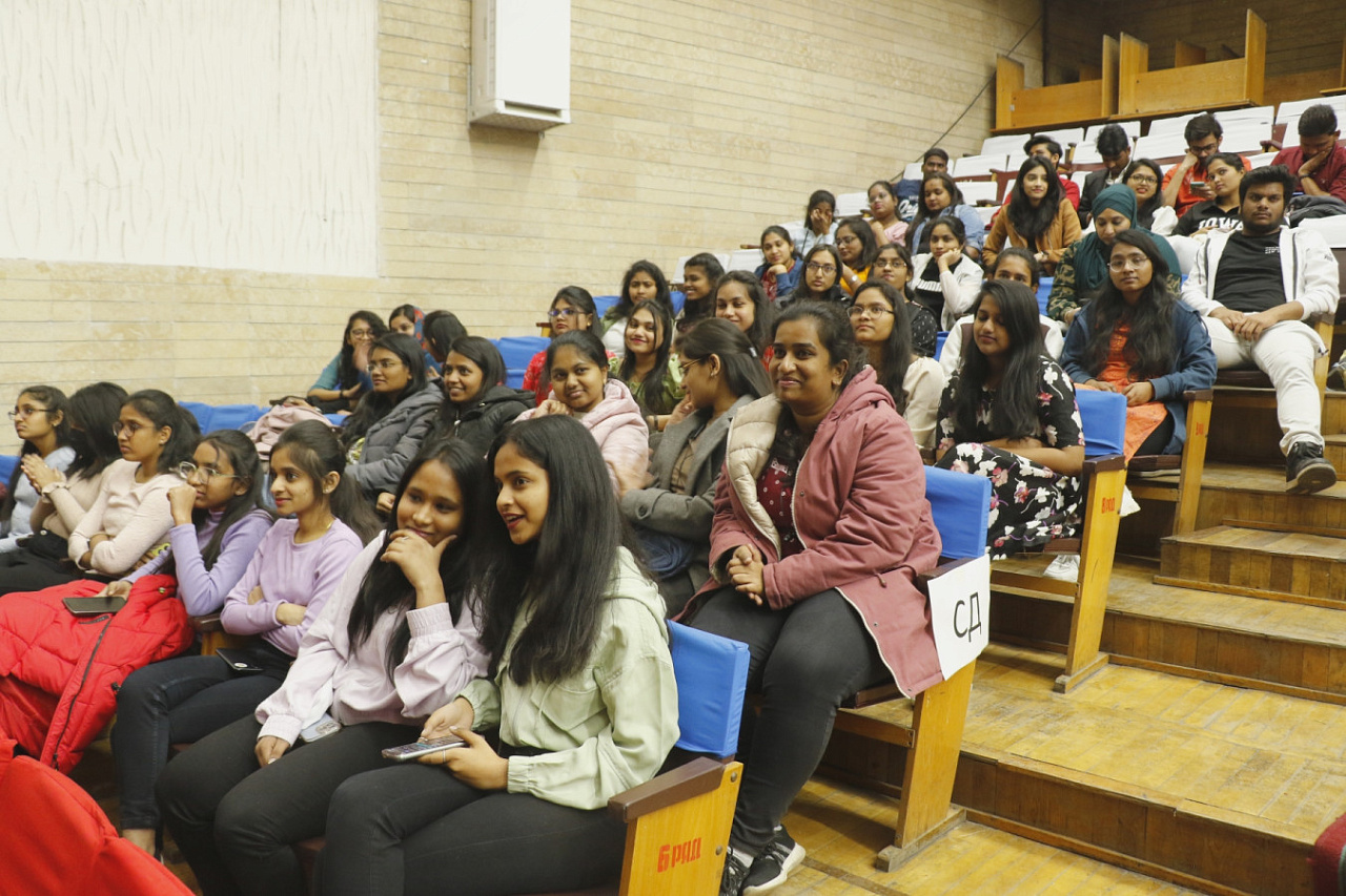 Ну а далее на сцене воцарилась экзотическая Индия! Наши студенты, прибывшие из этой древней и вместе с тем суперсовременной страны, но уже неплохо адаптировавшиеся в Бишкеке, сначала расшевелили публику каскадом своих ритмичных мужских, девичьих и смешанных танцев, затем подбодрили индийской песней «Tere Mitti» в исполнении студентки 5 курса Shivani Shetty и, наконец, вдохновенным стихотворением «Доктор», прочитанным студентом Ganham Sai.