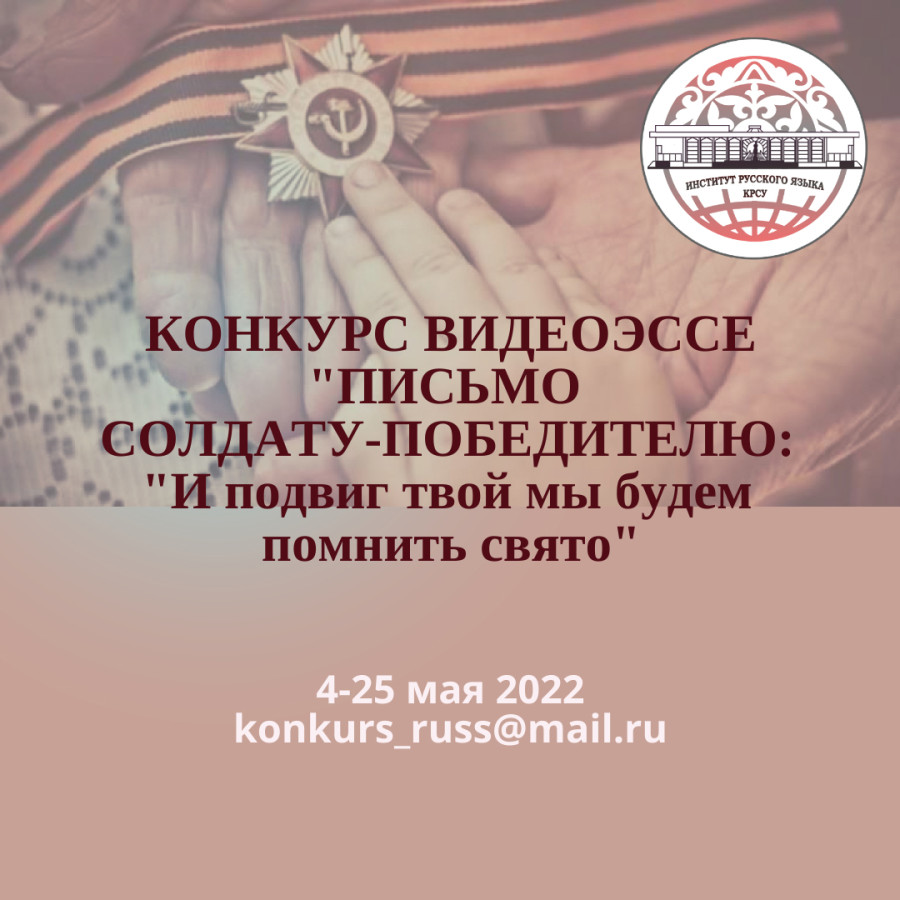 Кыргызско-Российский Славянский университет им. первого Президента Российской Федерации Б.Н. Ельцина и Институт русского языка КРСУ им. А.О. Орусбаева приглашают учащихся 8-х, 9-х и 10-х классов общеобразовательных школ, лицеев и колледжей Кыргызской Республики с русским, кыргызским и узбекским языками обучения принять участие в конкурсе видеоэссе «Письмо солдату-победителю: “И подвиг твой мы будем помнить свято”», приуроченном к 77-й годовщине Победы в Великой Отечественной войне.
