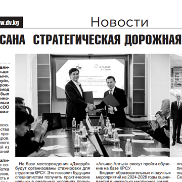 Кыргызско-Российский Славянский университет и ОсОО «Альянс Алтын» заключили Дорожную карту сотрудничества на 2024–2026 годы 30 января 2025 СМИ о КРСУ